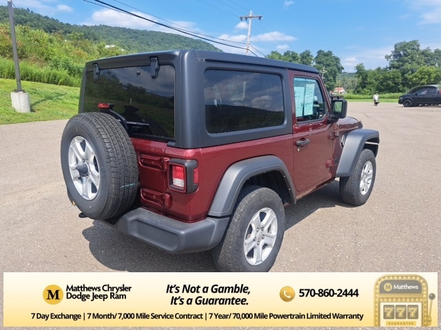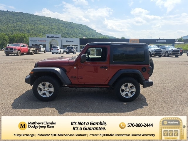 Well Equipped with: Quick Order Package 25S Sport S (Air Conditioning, Automatic Headlamps, Deep Tint Sunscreen Windows, Front 1-Touch Down Power Windows, Leather Wrapped Steering Wheel, Power Heated Mirrors, R1234YF A/C Refrigerant, Remote Keyless Entry, Security Alarm, Speed Sensitive Power Locks, Sport S, Sun Visors w/Illuminated Vanity Mirrors, and Wheels: 17" x 7.5" Tech Silver Aluminum), Technology Group (7.0" Touchscreen Display, Air Conditioning w/Auto Temperature Control, Air Filtering, Apple CarPlay, Cluster 7.0" TFT Color Display, For More Info Call 800-643-2112, Google Android Auto, GPS Antenna Input, Integrated Center Stack Radio, Radio: Uconnect 4 w/7" Display, SiriusXM Radio Service, SiriusXM Satellite Radio, and USB Host Flip), 110 mph Vehicle Max Speed Calibration, 3.45 Rear Axle Ratio, 4-Wheel Disc Brakes, 8 Speakers, ABS brakes, AM/FM radio, Black 3-Piece Hard Top, Brake assist, Cloth Low-Back Bucket Seats, Compass, Delay-off headlights, Driver door bin, Driver vanity mirror, Dual front impact airbags, Dual front side impact airbags, Electronic Stability Control, Freedom Panel Storage Bag, Front anti-roll bar, Front Bucket Seats, Front Center Armrest w/Storage, Front fog lights, Front reading lights, Integrated roll-over protection, Low tire pressure warning, Manuf Statement of Origin, No Soft Top, Normal Duty Suspension, Occupant sensing airbag, Outside temperature display, ParkView Rear Back-Up Camera, Passenger door bin, Passenger vanity mirror, Power steering, Radio data system, Radio: Uconnect 3 w/5" Display, Rear anti-roll bar, Rear reading lights, Rear Window Defroster, Rear Window Wiper/Washer, Side Steps, Speed control, Steering wheel mounted audio controls, Tachometer, Telescoping steering wheel, Tilt steering wheel, Traction control, Trip computer, Variably intermittent wipers, and Wheels: 17" x 7.5" Black Steel Styled.