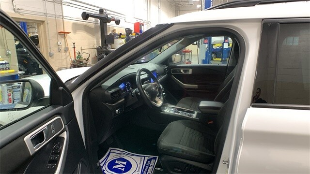 Oxford White 2020 Ford Explorer XLT 4WD 10-Speed Automatic 2.3L EcoBoost I-4 4WD, 1st & 2nd Row Heated Seats, 2nd Row 35/30/35 Bench w/E-Z Entry & Armrest, 3.58 Non-Limited-Slip Rear Axle Ratio, 3rd row seats: bench, 4-Wheel Disc Brakes, 6 Speakers, ABS brakes, Air Conditioning, Alloy wheels, AM/FM radio: SiriusXM, AM/FM Stereo, Auto High-beam Headlights, Automatic temperature control, Brake assist, Bumpers: body-color, Comfort Package, Compass, Delay-off headlights, Driver door bin, Driver vanity mirror, Dual front impact airbags, Dual front side impact airbags, Electronic Stability Control, Emergency communication system: SYNC 3 911 Assist, Equipment Group 200A, Exterior Parking Camera Rear, FordPass Connect, Four wheel independent suspension, Front anti-roll bar, Front Bucket Seats, Front Center Armrest, Front dual zone A/C, Front reading lights, Fully automatic headlights, Heated door mirrors, Heated Steering Wheel, Illuminated entry, Knee airbag, Leather steering wheel, Low tire pressure warning, Occupant sensing airbag, Outside temperature display, Overhead airbag, Overhead console, Panic alarm, Passenger door bin, Passenger vanity mirror, Power door mirrors, Power driver seat, Power Liftgate, Power passenger seat, Power steering, Power windows, Rear air conditioning, Rear anti-roll bar, Rear reading lights, Rear window defroster, Rear window wiper, Remote keyless entry, Roof rack: rails only, Security system, Speed control, Speed-sensing steering, Speed-Sensitive Wipers, Split folding rear seat, Spoiler, Steering wheel mounted audio controls, SYNC 3 Communications & Entertainment System, SYNC 3/Apple CarPlay/Android Auto, Tachometer, Telescoping steering wheel, Tilt steering wheel, Traction control, Trip computer, Unique Cloth Captain's Chairs, Variably intermittent wipers, Wheels: 18" 5-Spoke Sparkle Silver-Painted Alum.