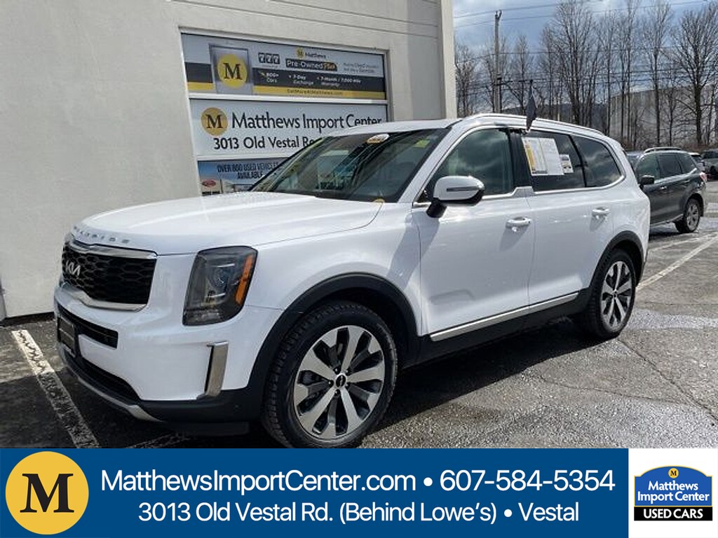 Matthews Import Center promises each customer a thorough and confident 120-point inspection on our used inventory guaranteeing a relaxing and peace-of-mind experience. We are located behind Lowes in Vestal NY. Or call us at (607) 729 - 6261Matthews Import Center3013 Old Vestal RoadVestal NY 13850. Glacial White Pearl 2022 Kia S Telluride AWD 8-Speed Automatic 3.8L V6 DOHC